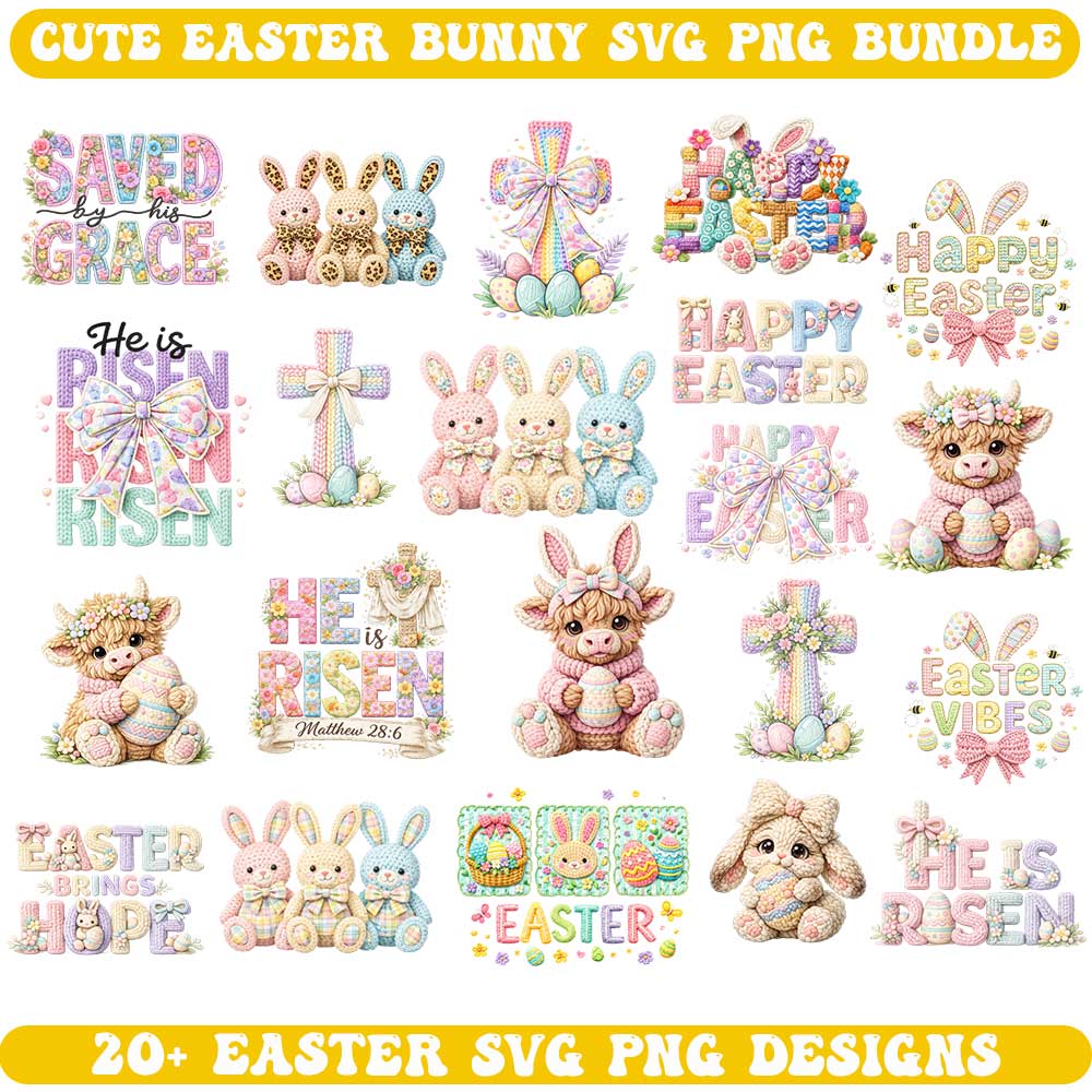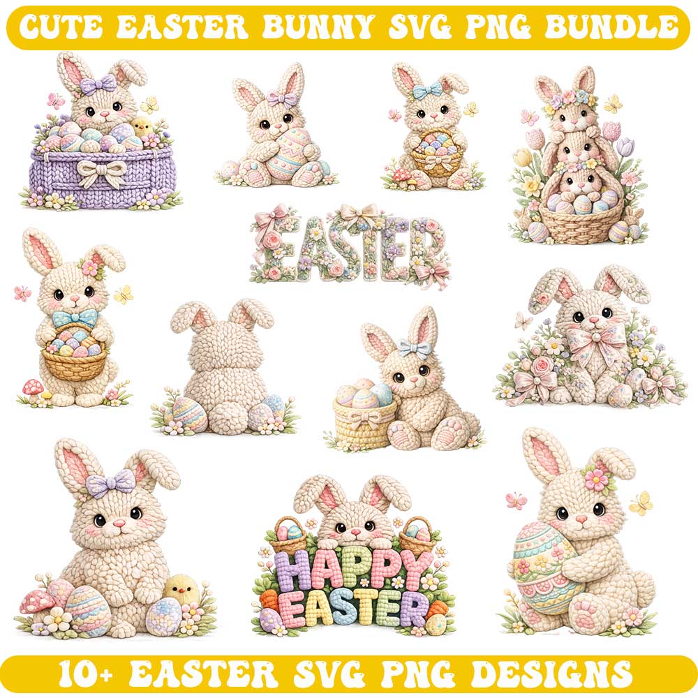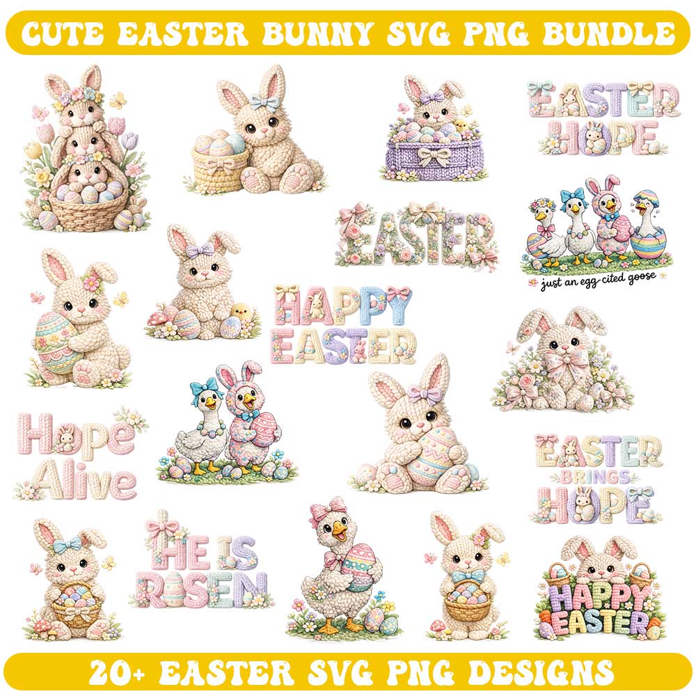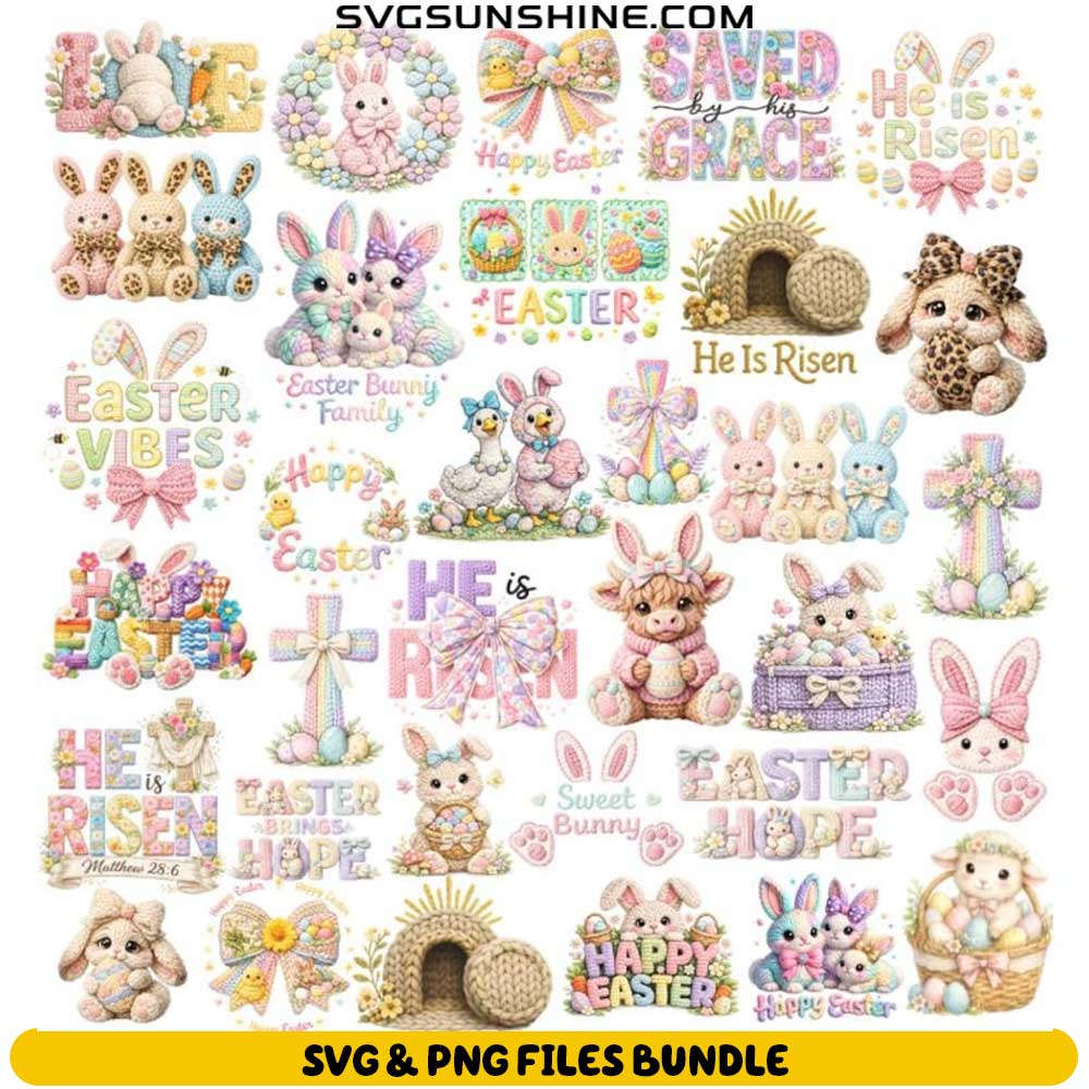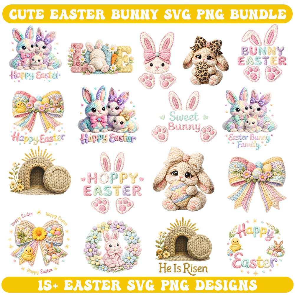 Faux Embroidery Easter SVG Bundle – Knitted Style Bunny Easter SVG PNG Files for Cricut